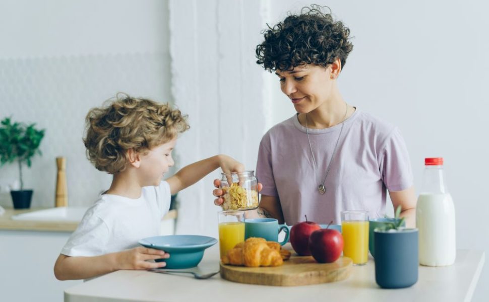 Att använda enkla ingredienser som redan finns hemma och låta barnen vara delaktiga i valet eller upplägget gör också att de blir mer intresserade av maten och tycker att frukosten blir rolig.